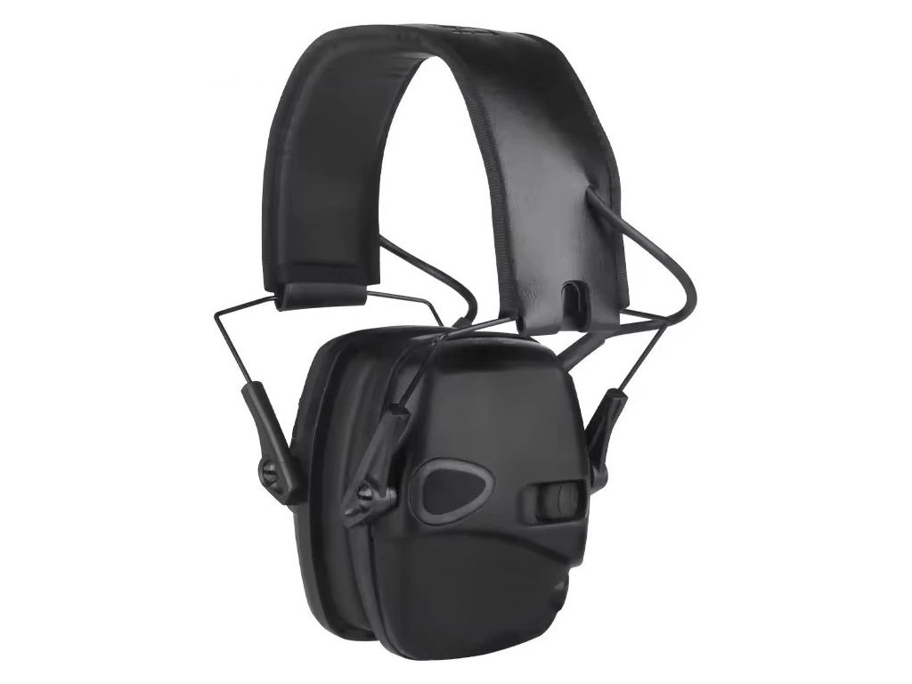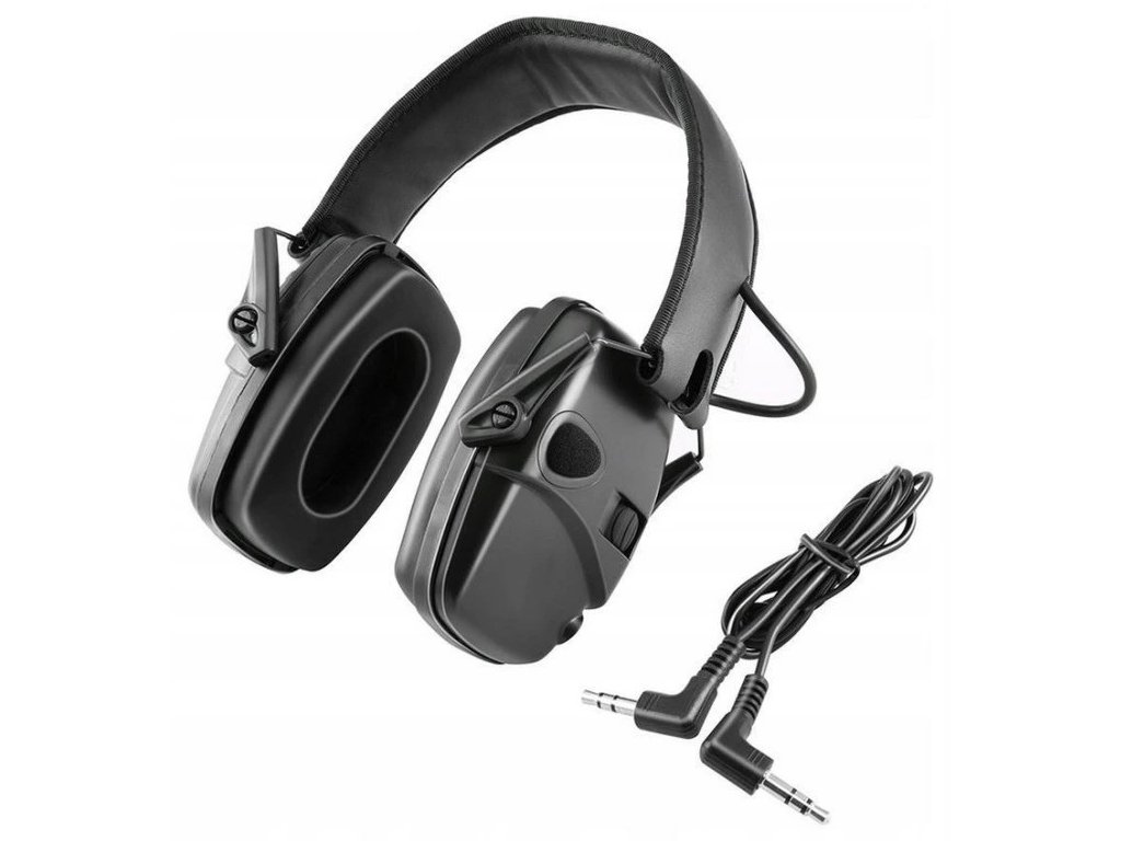 Černé aktivní sluchátka určená pro použití v terénu nebo na střelnici.