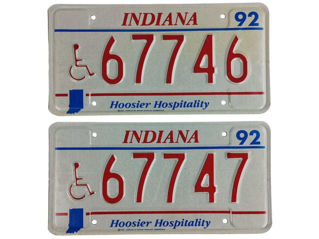Americká státní poznávací značka na auto státu Indiana z roku 1992 USA License plates handicap