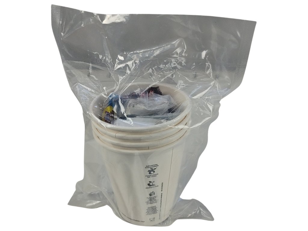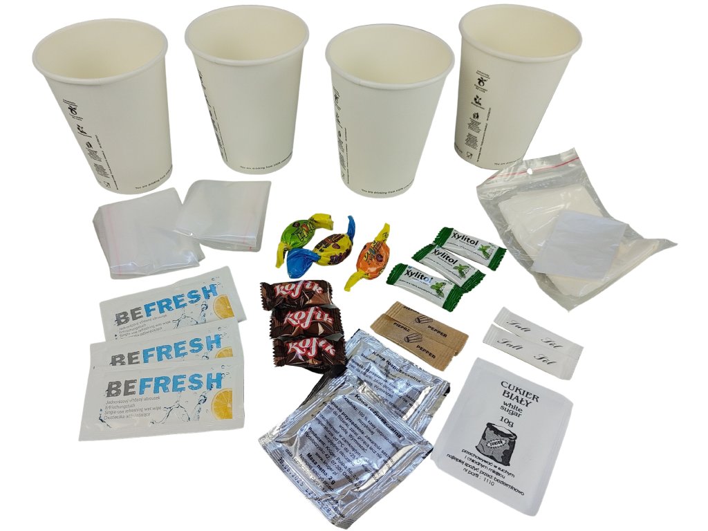 Obsah sady: Sada obsahuje instantní kávu, cukr, sůl, pepř, Xylitol žvýkačky, vlhčené ubrousky a papírové kelímky. Tyto položky jsou typické pro individuální balíčky určené k rychlé konzumaci a zajištění základních hygienických potřeb v polních podmínkách.