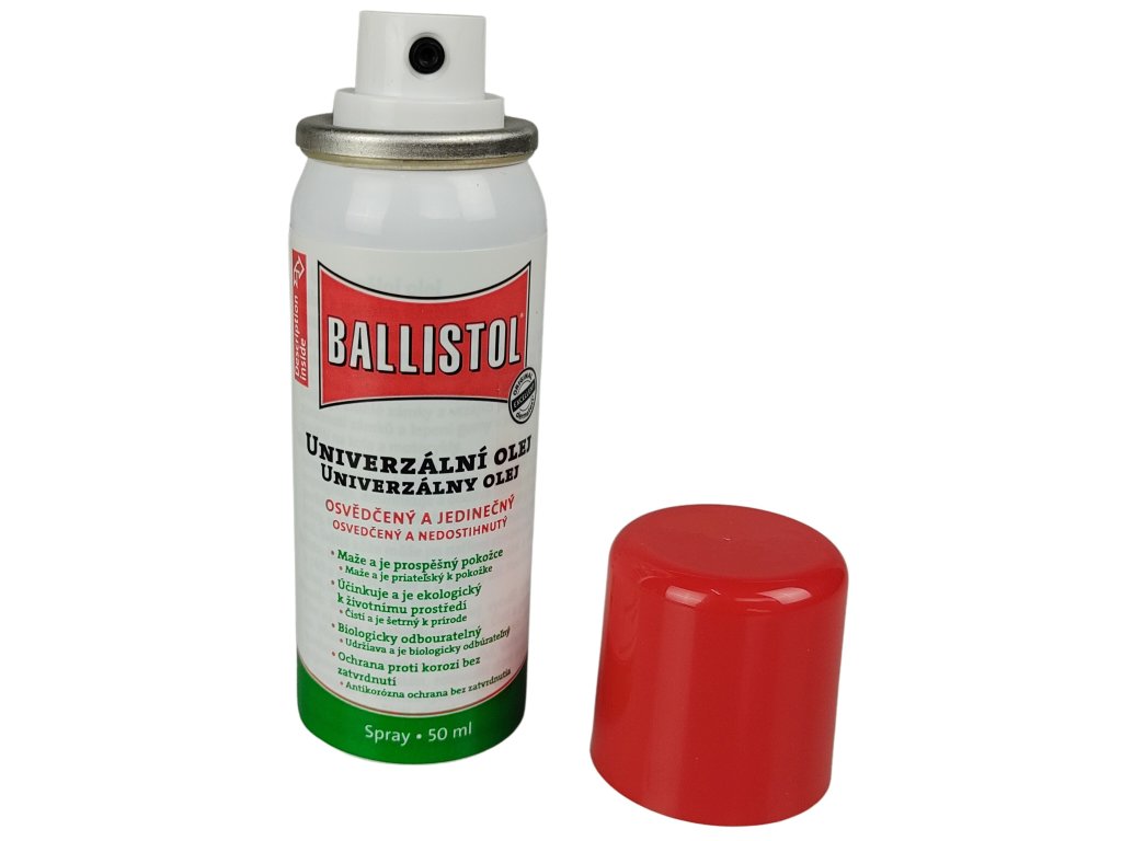BALLISTOL® Univerzální speciální olej čistí a konzervuje zbraně jako celek – kov, dřevo i další materiály, odstraňuje usazeniny olova, mědi a tombaku v hlavni, neutralizuje kyselé splodiny po hoření prachu. Ballistol neškodí, ale pěstuje lidskou pokožku. Spray s dávkovačem.