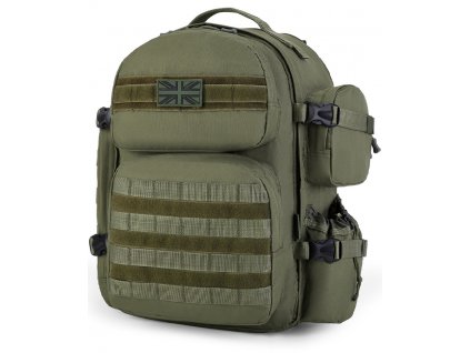 Na stranách batohu jsou čtyři kapsy. Dvě horní větší, uzavřené, nastavitelné v objemu a pokryté MOLLE vazbou a dvě menší, otevřené ty jsou umístěny níže. Na víku batohu je další velká kapsa na zip. Batoh má praktickou rukojeť pro nošení batohu.Systém je uživatelsky přívětivý, snadno se nastavuje pomocí regulátorů. Zádové dvě bodové podložky a jedna bederní podložka pokrytá distanční mřížkou zajišťují, že mezi zády a batohem proudí vzduch, takže záda se příliš nepotí. Anatomicky tvarované nosné popruhy mají D-kroužky a svislý pás, ke kterému lze připojit další vybavení. Nosný popruh je široký a pohodlný, navíc pokrytý molle vazbou. Toto je zvláště užitečné řešení, protože na něj můžeme připevnit např. nádoby na vodu nebo věci,které potřebujeme mít po ruce.