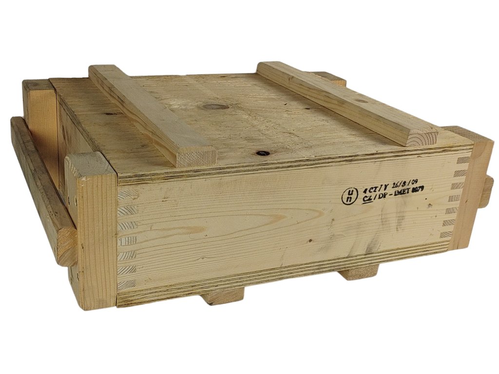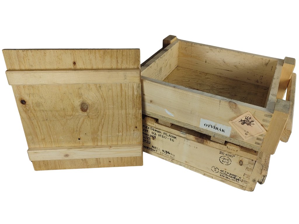 - Robustní dřevěná bedna od nábojů 7,62 mm, 9 mm Makarov nebo jiné munice a pyrotechniky.