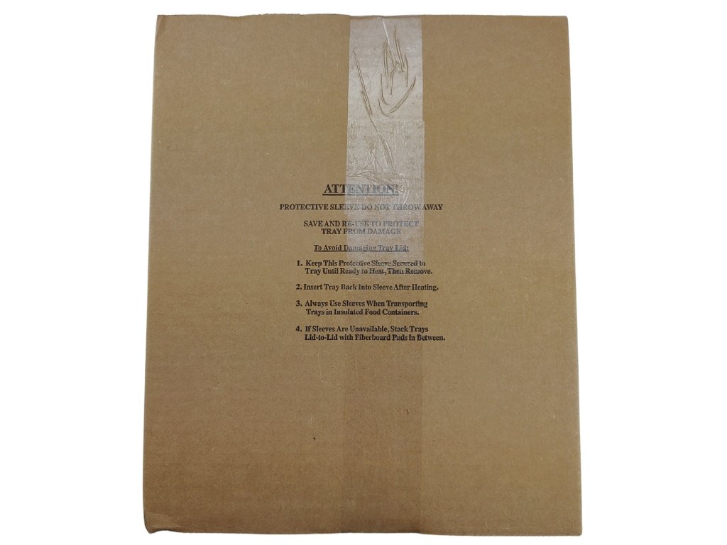 Zásobníky MRE jsou používány americkou armádou pro aplikace polní kuchyně při krmení velkých skupin bojových a podpůrných vojáků. Jsou baleny ve velkých, stabilních, flexibilních a pevných poly-zásobníkách. Tento podnos obsahuje 30 uncí plně uvařeného, připraveného mrkvového dortu a 6 uncí ledové polevy. Obsahuje 18 porcí.