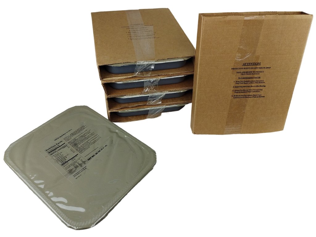 Zásobníky MRE jsou ideální pro krmení větších skupin a rodin. Každý zásobník má rozměry 10″ x 12-1/2″ x 2″. Podnosy jsou zkonstruovány tak, aby se daly stohovat, takže jsou ideální pro skladování potravin, skříně, spíže a stísněné prostory.