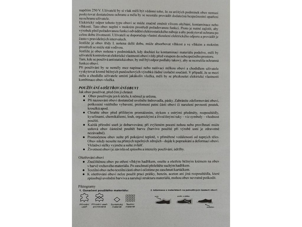 - ČSN EN ISO 20345 S2 CI (Odolnost spodku obuvi proti chladu).