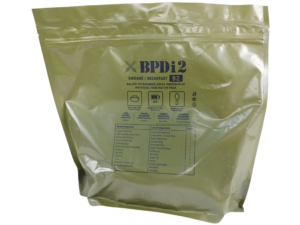 B2 (BPDi2) balíček snídaně, což je balená potravinová dávka pro jednotlivce (individual food ration pack). Jedná se o koncept vojenské potravinové dávky, který splňuje dietní potřeby Armády České republiky (AČR).