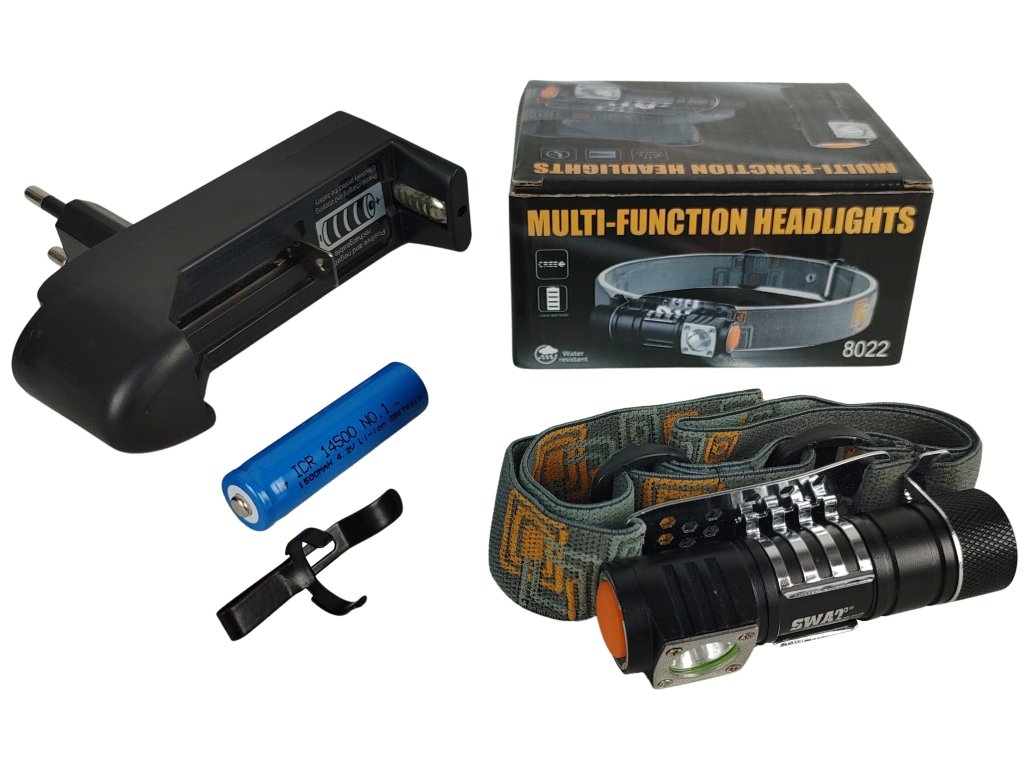 Čelovka multifunkční LED Cree IPX-8 taktická svítilna s klipem a nabíječkou do sítě HT-3413