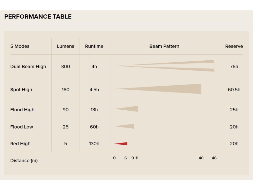 - bilá bodová + rozptýlená 300lm (4 hodiny, 46 metrů)
