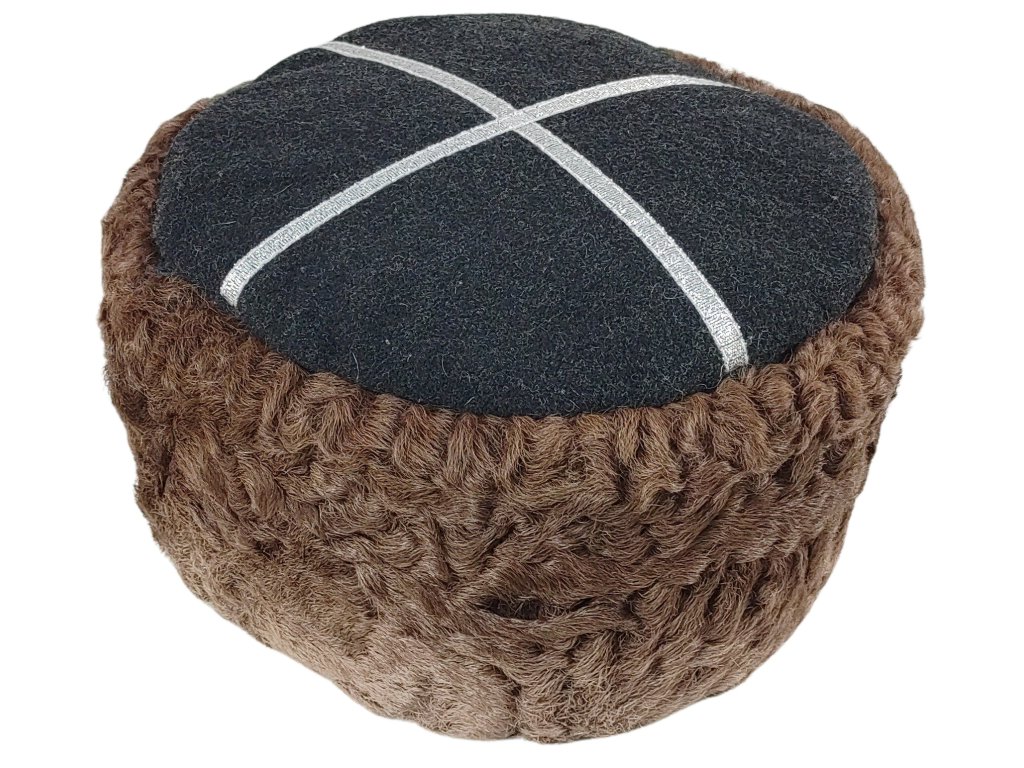 Originální sovětská zimní čepice "Papakha", známá jako kozácký klobouk nebo "Kubanka". Vyrobena z přírodní hnědé jehněčí kožešiny s černým vlněným vrškem, který je navíc zdoben stříbrnými pruhy, určena pro řádné plukovníky, generály a maršály armády Sovětského svazu a Ruské federace.