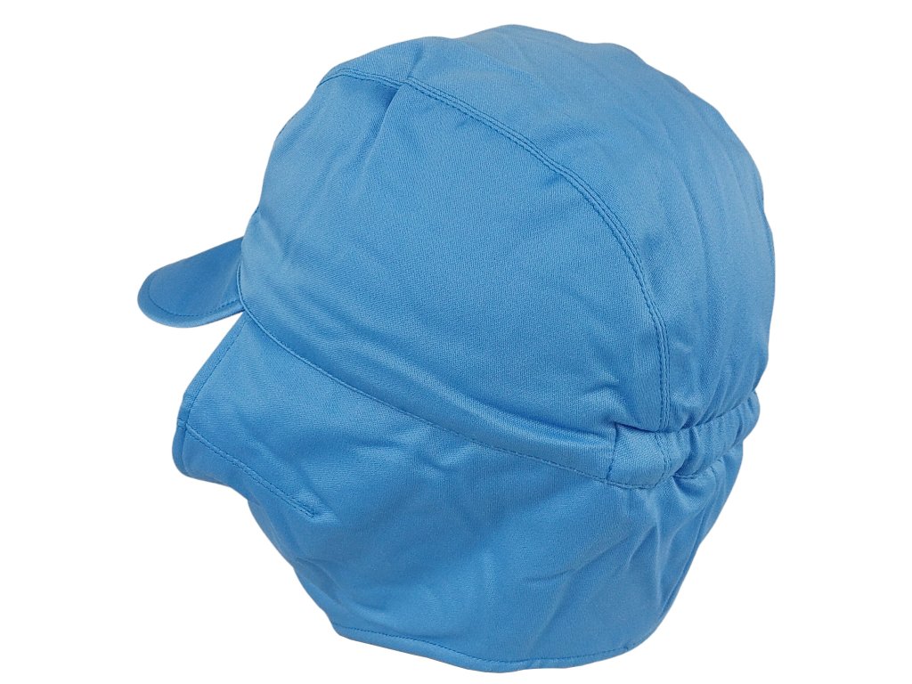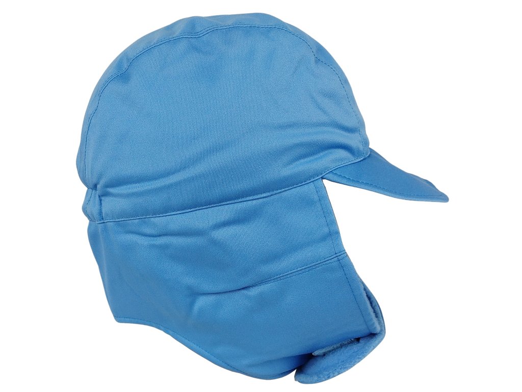 Belgická světle modrá čepice s chráničem uší a zátylku, určena k nošení v chladném počasí během mírových misí OSN v chladnějších oblastech.