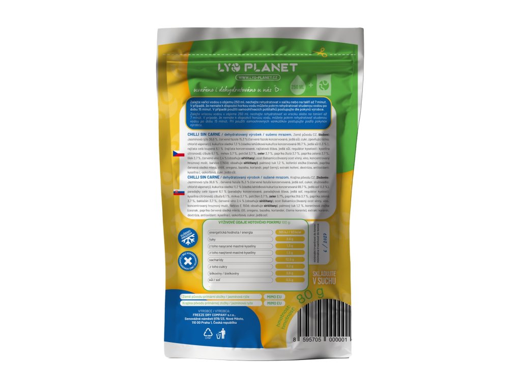 Složení: Jasmínová rýže 36,6 %, červené fazole 15,3 % (červené fazole konzervované, jedlá sůl, cukr, zpevňující látka: chlorid vápenatý), kukuřice sladká 7,3 % (sladká lahůdková kukuřice konzervovaná 99,7 %, jedlá sůl 0,3 % ) , rajčata celá loupaná 6,1 % (rajčata konzervované, rajčatová šťáva, jedlá sůl, regulátor kyselosti: kyselina citronová), cibule 6,1 %, mrkev 3,7 %, petržel 3,7 %, celer 3,7 %, paprika žlutá 3,7 %, paprika zelená 3,7 %, lilek 3,7 %, červené víno 2,4 % (obsahuje siřičitany), ocet Balsamico (kvasný ocet vinný, víno, koncentrovaný hroznový mošt, barvivo E150d; obsahuje siřičitany), palmový tuk 1,2 %, kořenicí složka (česnek, paprika červená sladká mletá, chilli, oregano, bazalka, koriandr, pepř černý), extrakt koření, dextróza, antioxidant: kyselina L-askorbová, cukr, jedlá sůl.