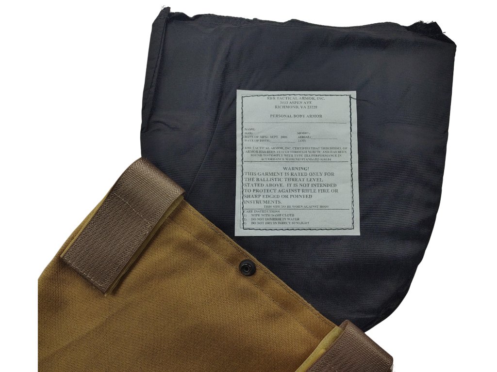 Chránič je vyroben z odolného nylonu Cordura®, který je odolný proti oděru a má vodoodpudivou úpravu. Uvnitř chrániče je vsunuta měkká balistická vložka z kevlarového vlákna, avšak s prošlou expirační dobou - bez garance původních vlastností balistické ochrany.