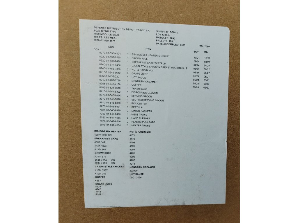Tyto balíčky skupinové stravy jsou používány americkou armádou pro aplikace polní kuchyně při krmení velkých skupin bojových a podpůrných vojáků.
