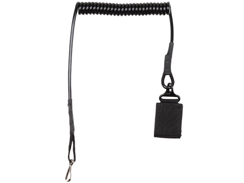 Bezpečnostní kroucený kabel k zajištění pistole. Poutko se suchým zipem umožňuje přichycení k opasku nebo upínací vazbě systému MOLLE.