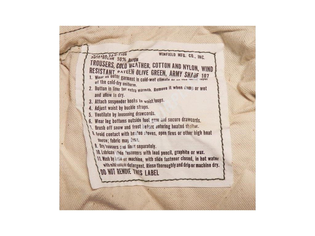 - TROUSERS, COLD WEATHER, COTTON AND NYLON, WIND RESISTANT SATEEN OLIV GREEN, ARMY SHADE 107
