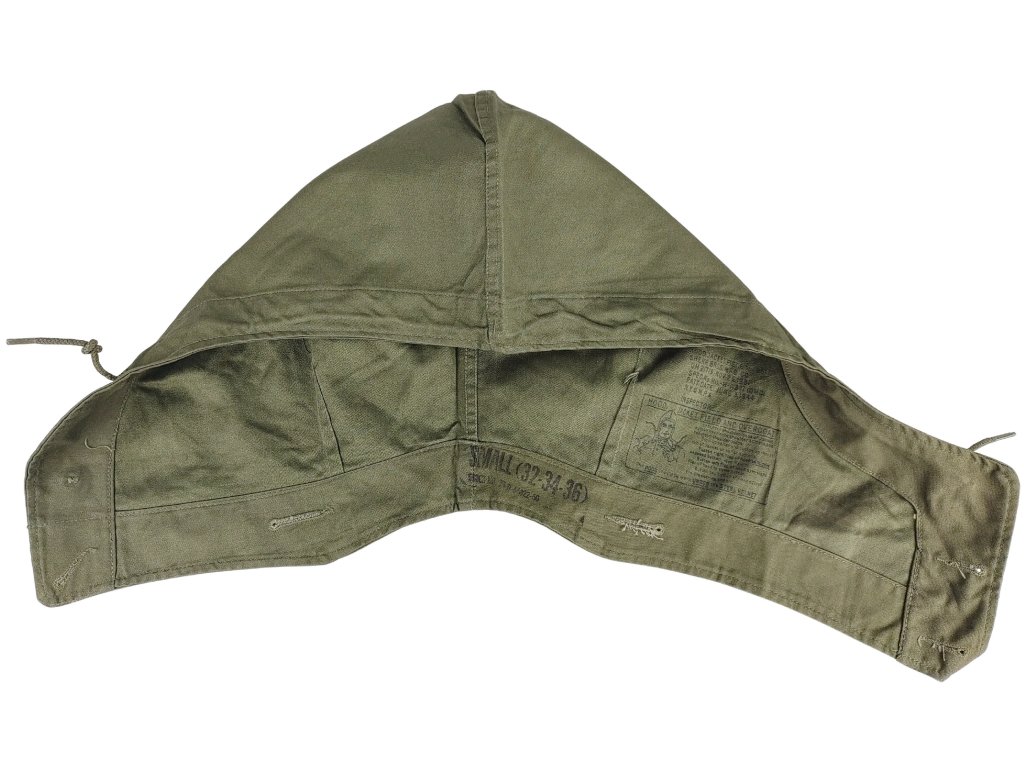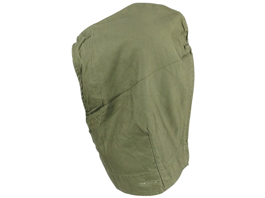 - Použité zboží (kapuce nesou stopy běžného užívání a dlouhodobého skladování, mají různé odstíny zelené barvy, na své stáří přes 70. let jsou v dobrém a zachovalém stavu bez poškození, nemusí však mít čitelné visačky, vyřazené z armádních zásob).