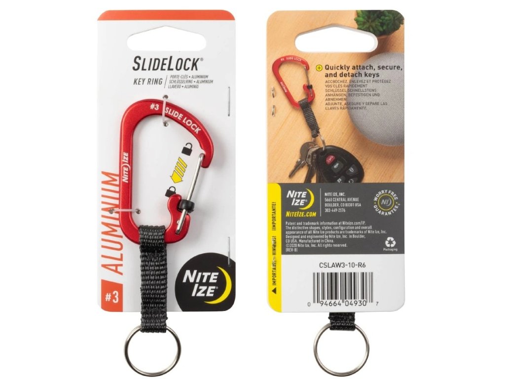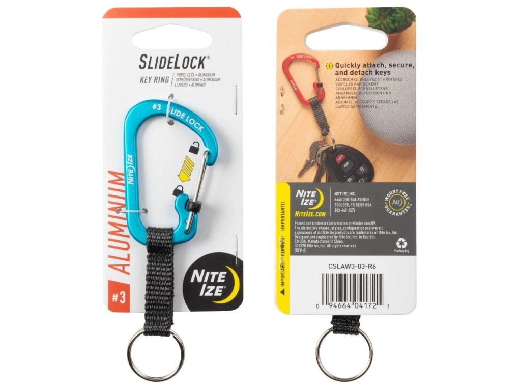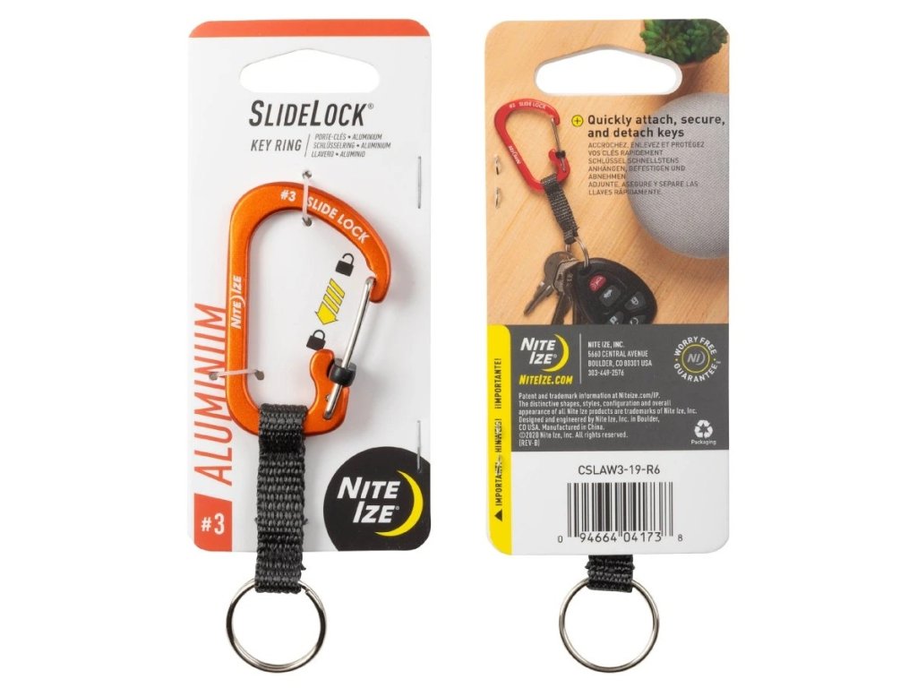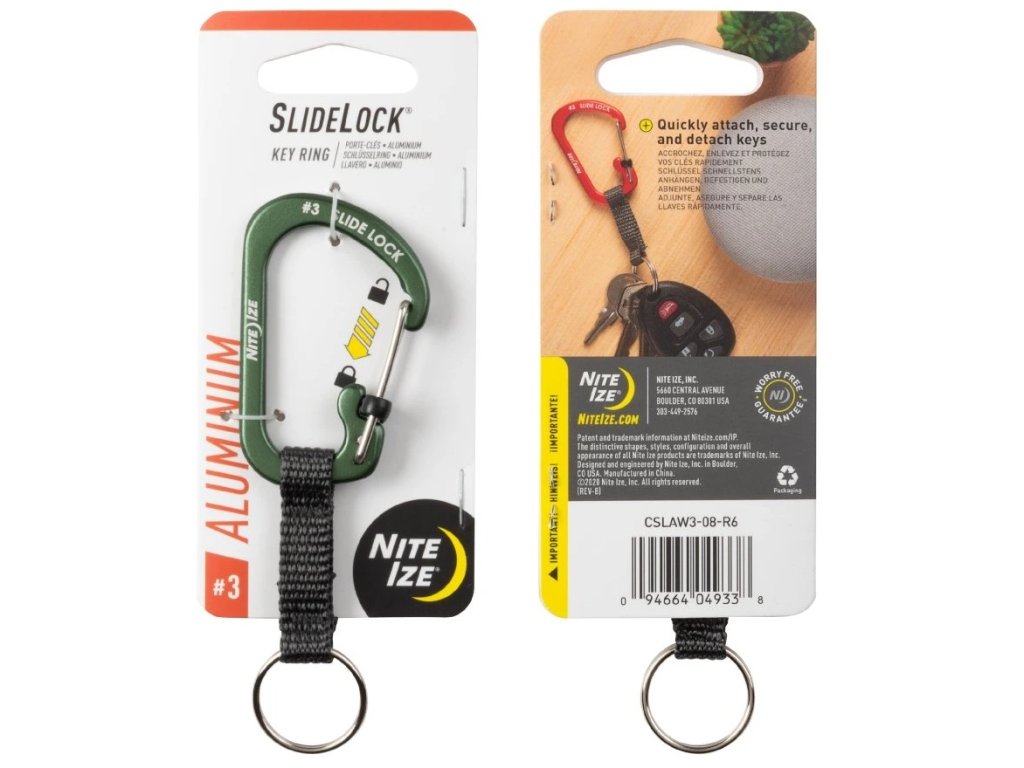 Klíčenka Nite Ize® SlideLock® Key Ring Aluminum je super řešením držení klíčů, spojuje bezpečnou karabinu #3 SlideLock® z hliníku s odolným kroužkem na klíče a spojuje je pevným nylonovým popruhem. Tato kombinace vytváří skvělý způsob, jak udržet klíče spojené, ale zároveň oddělené. Karabinu lze připnout a uzamknout k čemukoli, například k poutku na opasek, batohu nebo láhvi s vodou, zatímco kroužek na klíče volně visí na popruhu.