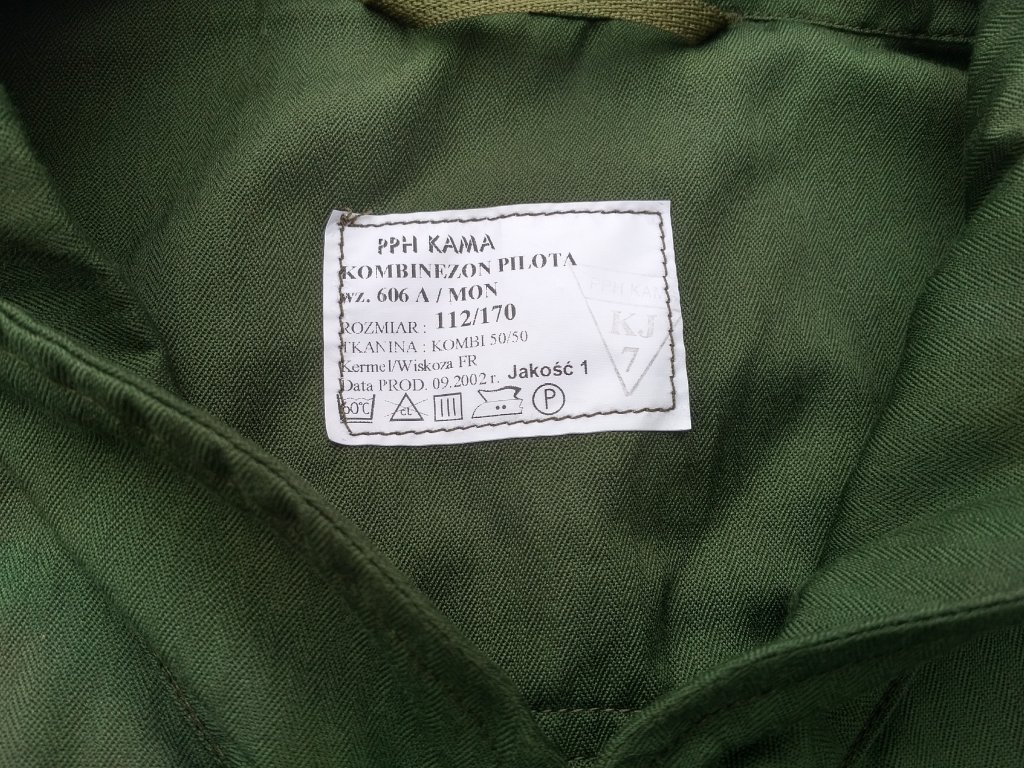 Pilotní kombinéza ze zdrojů polské armády. Je vyrobena z nehořlavé tkaniny složené z 50% aramidimidového vlákna KERMEL, 50% VISKOZA