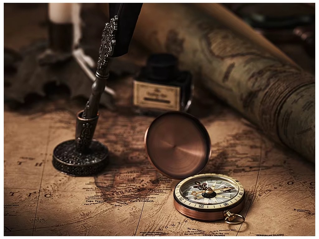 - Vyklenuté, tvrzené sklo a mosazná směrová střelka společně s vnitřním kovovým potiskem ciferníku připomínají klasický vzhled kompasů z minulosti.