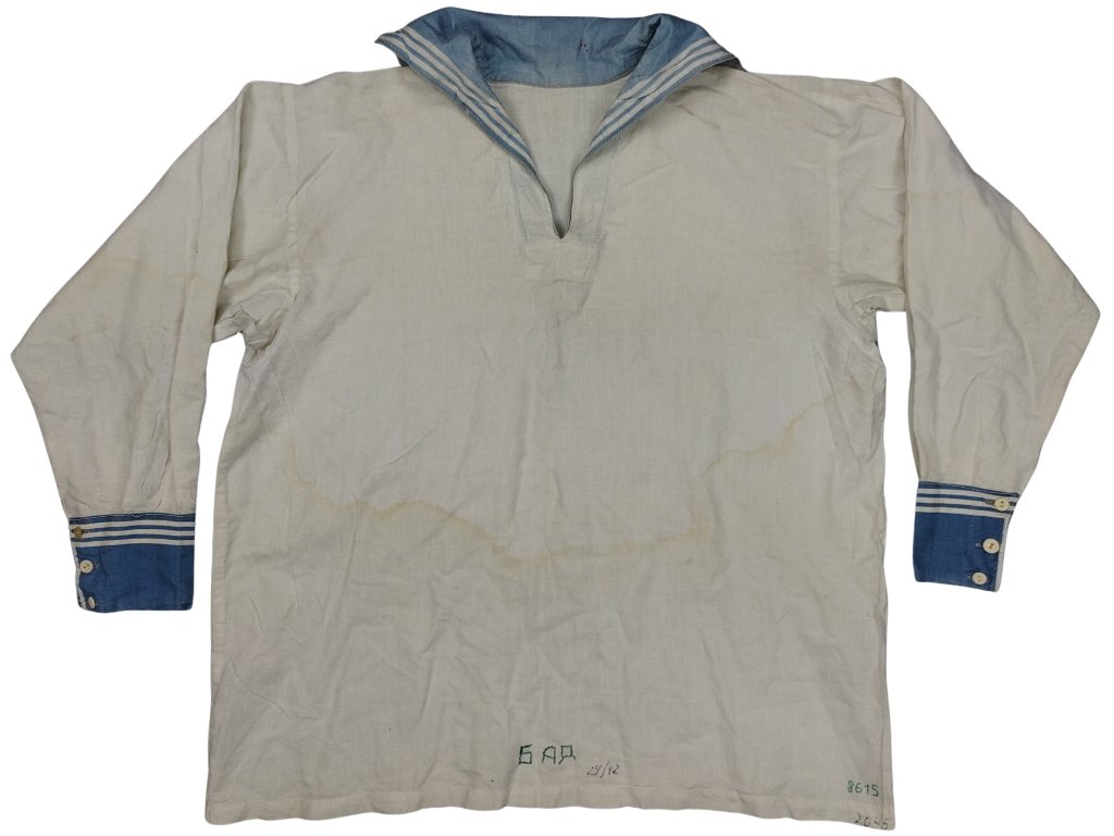 Uniforma sovětských námořníků. Bílá námořnická košile sovětské námořní flotily. Přebytečný kus použitého vybavení Sovětského svazu.