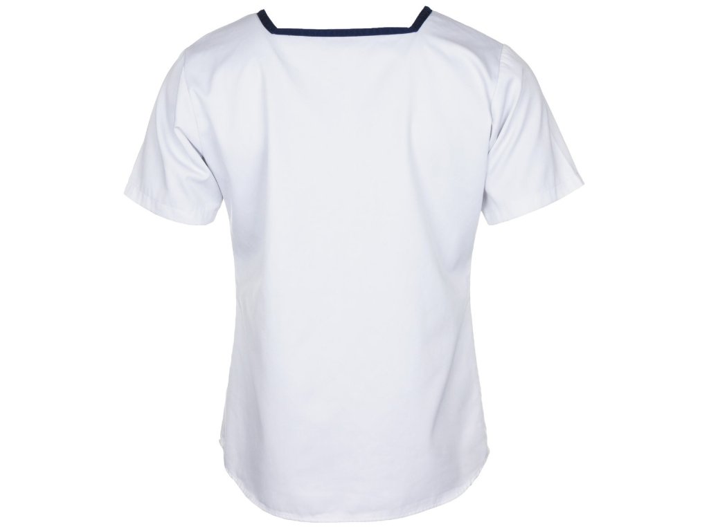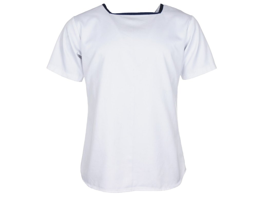 Britská námořní košile s hranatým výstřihem (Shirt Mans Class II RN / Shirt Woman's Class II RN), bílá, pánská nebo dámská. Jako součást uniformy Royal Navy mají tyto bílé kroje třídy II krátké rukávy a hranatý výstřih, který je doplněn modrým lemováním kolem límce. Tyto kroje, vyrobené z 80% bavlny a 20% polyesteru, jsou vysoce kvalitní originály, ideální pro cokoli od maškarních kostýmů až po námořní rekonstrukce.