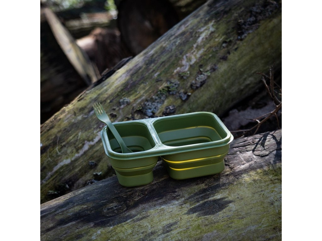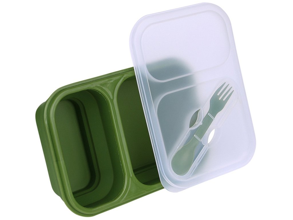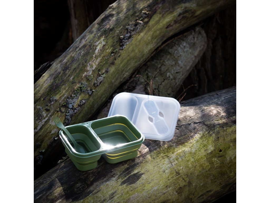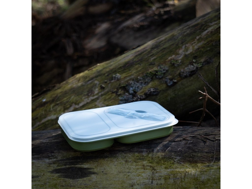 Skládací box na potraviny, v jehož víčku je vložený jednoduchý příbor - lžíce a vidlička. Jídelní, obědový nebo svačinkový box má dvě samostatné, přehrádkou oddělené misky, které můžete používat ve složeném i rozloženém stavu.