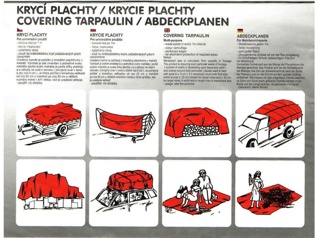 Krycí plachta s kovovými oky po 1 m a zažehleným okrajem. Slouží ke krátkodobému krytí požadovaných ploch. Ochrana proti UV záření. GARANTOVANÝ ROZMĚR PLACHTY.