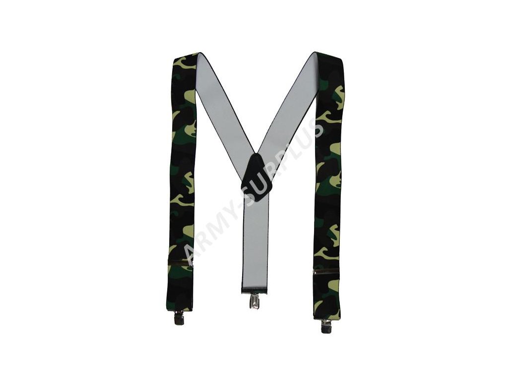 - Kvalitní a pohodlné kšandy - elastické šle ve vzoru "Y" ("ypsilonky") s lesním maskovacím potiskem kamufláže Woodland.