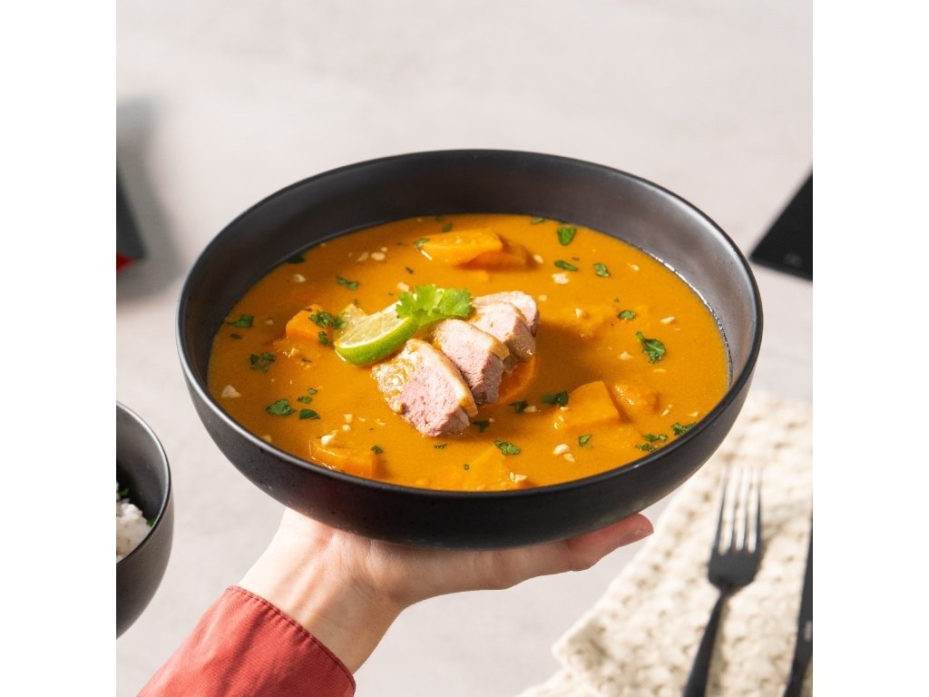 Křehká kachní prsa v jemně pálivém thajském kari s batáty, mrkví a kokosovým mlékem, dochucená tamarindovou a massaman pastou s vybranou směsí exotického koření.