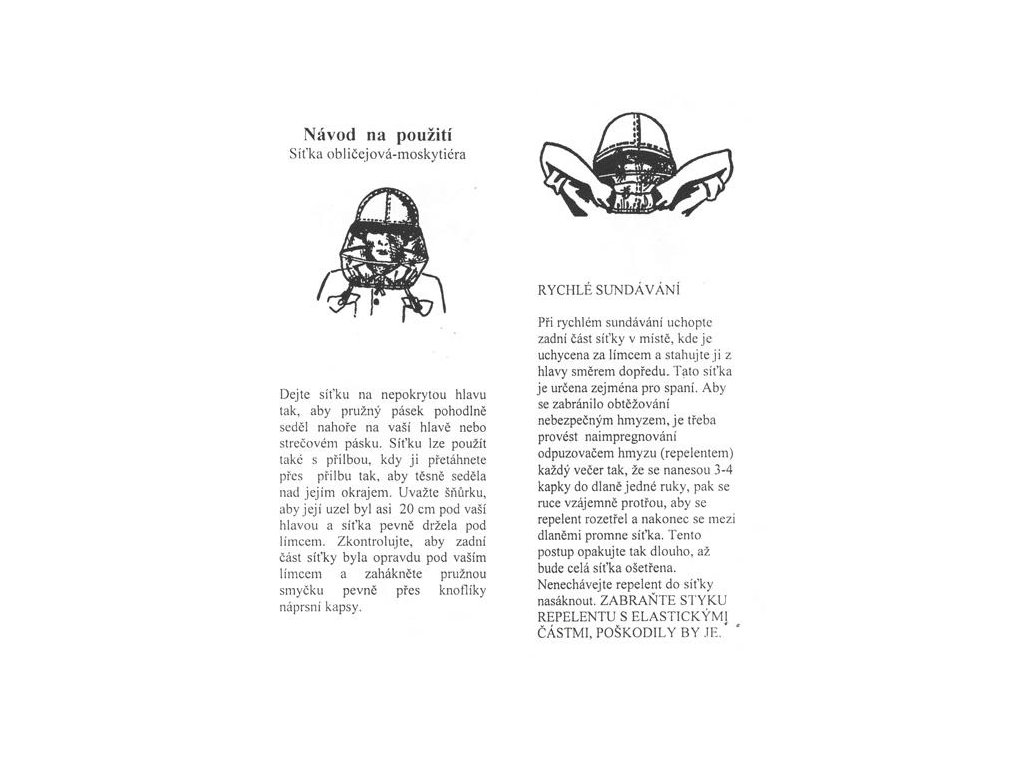 - Moskytiéra se nasadí na hlavu, přilbu nebo pokrývku hlavy.