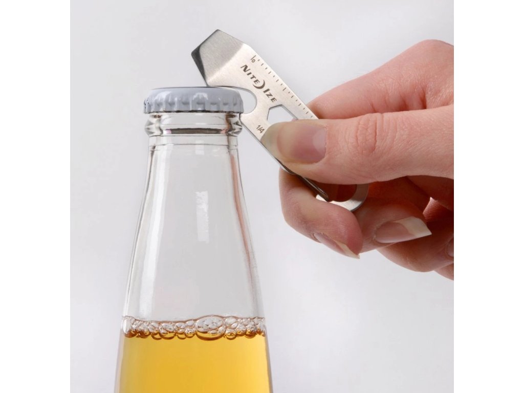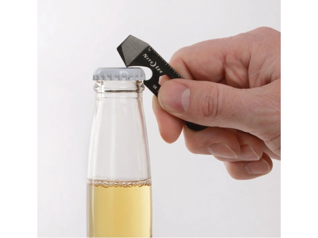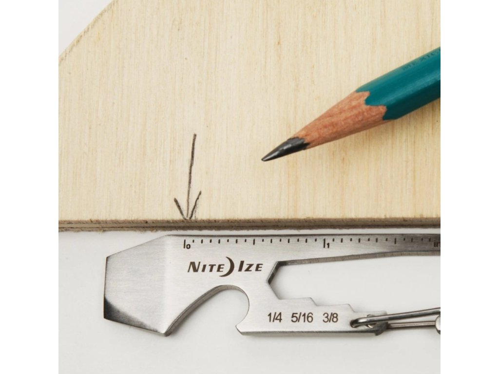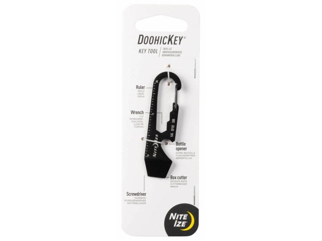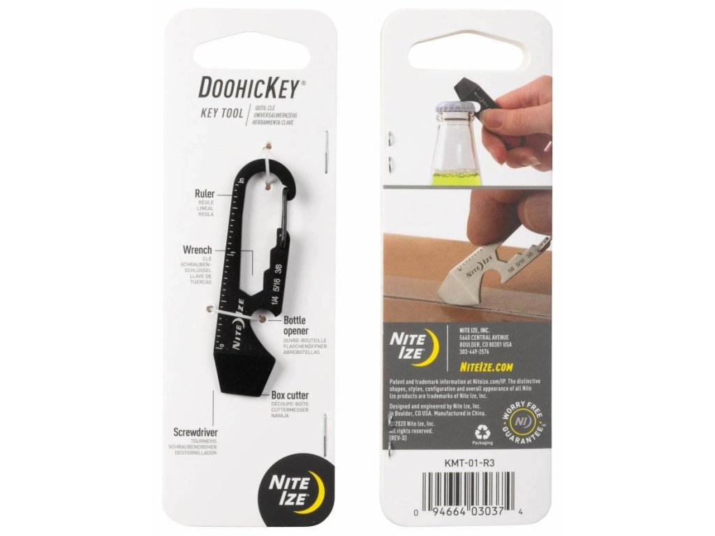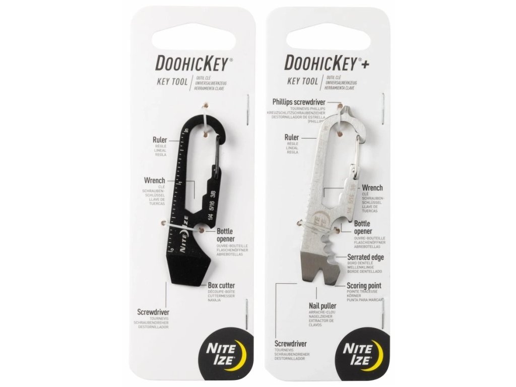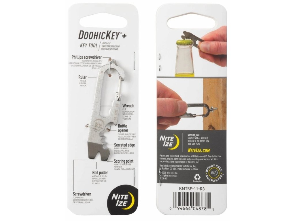 DoohicKey má pevné karabinové oko a zámek z drátu z nerezové oceli. Oko karabiny je vytvarováno tak, aby se dalo použít jako klíč na matky. Protože je provedení výřezové, použijete ho jak na palcové míry, tak i na metrické. Naproti zámku karabiny najdete pravítko, a to jak v centimetrech, tak v palcích. Na užším konci nástroje je otvírák na lahve, který se prostě hodí vždycky, dále zde najdete plochý šroubovák a řezák ideální na krabice, balení vody a podobně. DoohicKey má jednoduchý a praktický design, takže z něj nic nevyčnívá a nic nepřekáží. Právě to z něj dělá ideálního každodenního pomocníka.