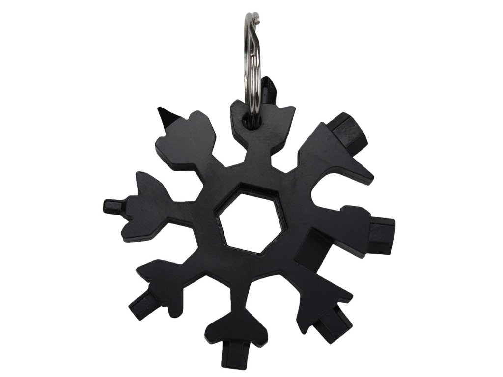 Multifunkční nerezové nářadí ve tvaru sněhové vločky s kroužkem na klíče. Vyrobeno z nerezové oceli. Nástroj obsahuje různé funkce, jako jsou nástrčné klíče, imbusové klíče, otvírák a šroubovák. Díky svému designu je praktickým doplňkem pro každodenní nošení (EDC).