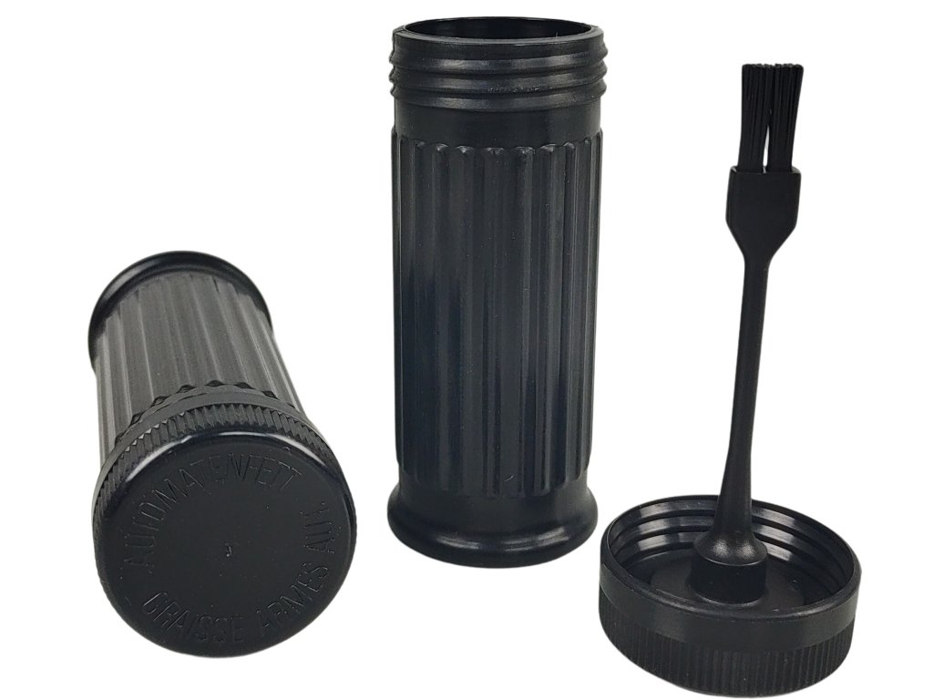 Tato praktická nádoba pochází ze sady na čištění útočných pušek švýcarské armády. Ve víčku je integrovaný štěteček, který umožňuje snadnou a přesnou aplikaci maziva.
