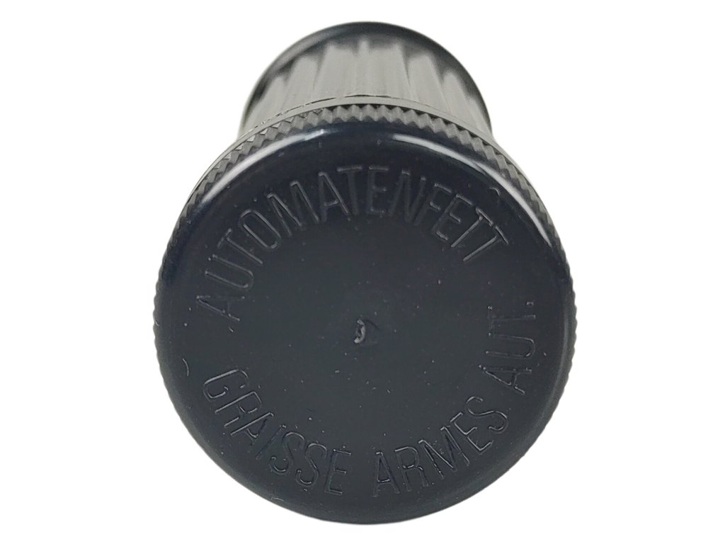 Na víčku je německý nápis "AUTOMATENFETT" a francouzský "GRAISSE ARMES AUTOMATIQUES", což v překladu znamená "mazivo pro automatické zbraně".