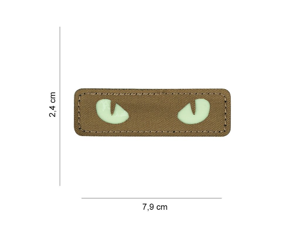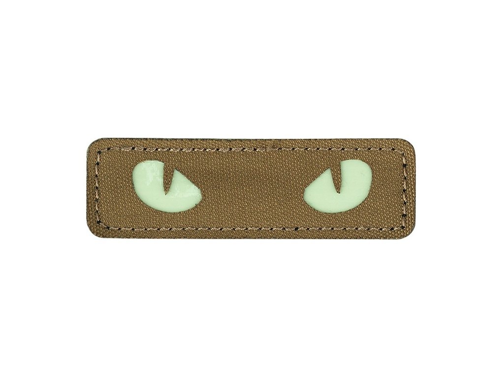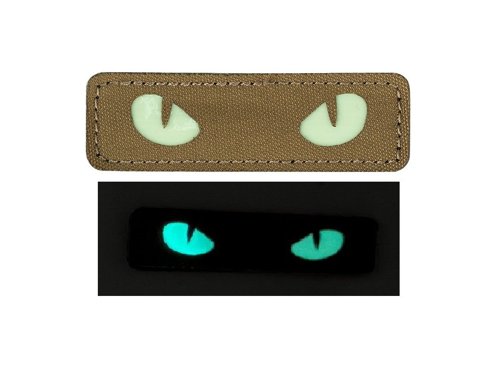 - Materiál a design: Nášivka je vyřezávaná moderní laserovou technologií, s motivem kočičích očí v bílé barvě na hnědém podkladu barvy Coyote. Bílé části jsou luminiscenční a svítí ve tmě.