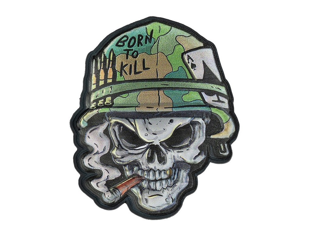 Text: Na horní části přilby je anglický nápis "BORN TO KILL", což je v českém překladu "ZROZEN K ZABÍJENÍ".