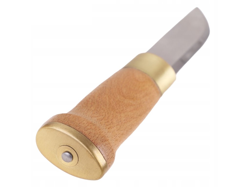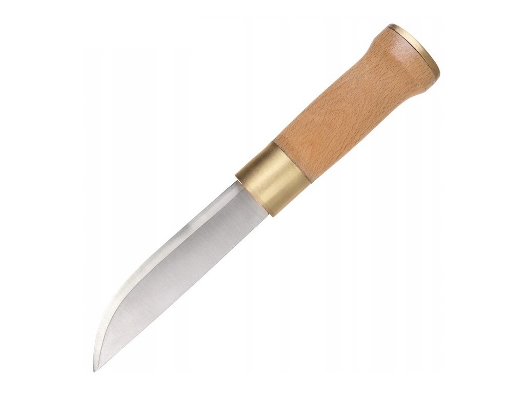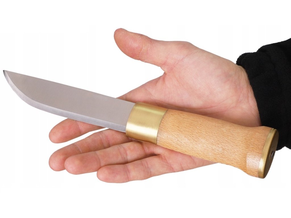 Rukojeť tohoto nože, vyrobená z bukového dřeva, je ergonomická a zajišťuje bezpečné uchopení. V zadní části rukojeti je navíc ocelová hlava, která plní funkci provizorního kladiva při polních pracích.