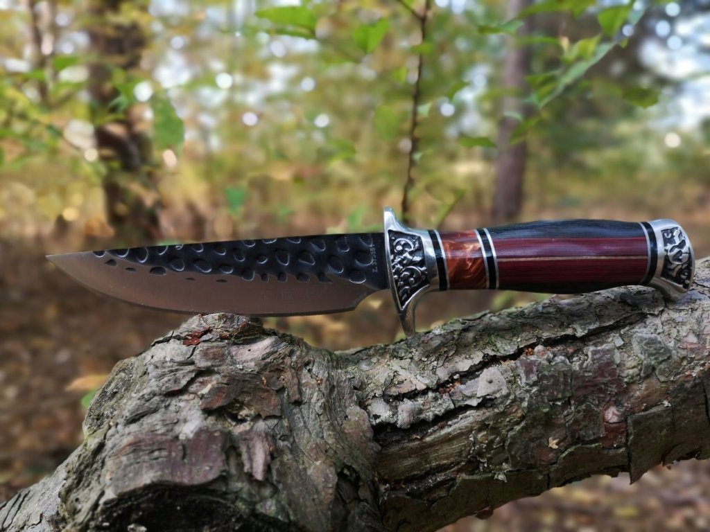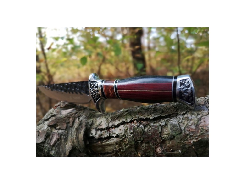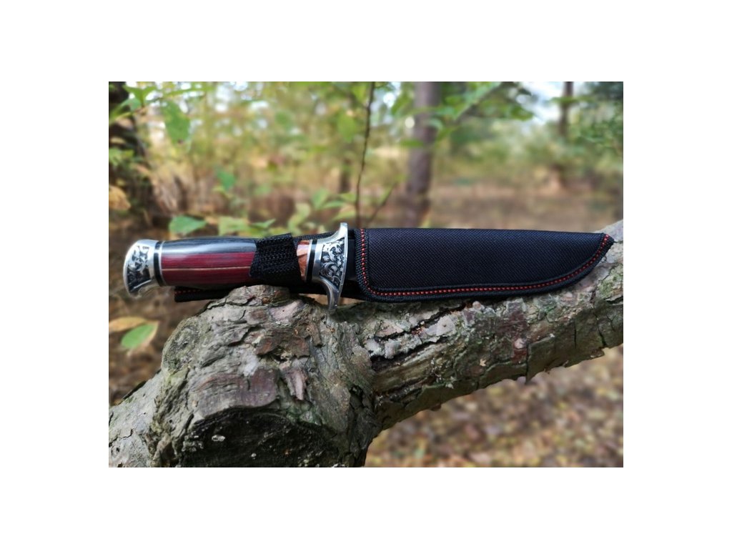 Tento velký lovecký nůž má úhlednou kónickou čepel 440C, nabroušenou do ostré hrany. Rukojeť je vyrobena z kombinovaného dřeva s kovovým zdobením. Základní kryt a chránič palce jsou do detailu propracované s designem připomínajícím vinnou révu. Skvěle vypadající nůž do každé sbírky.