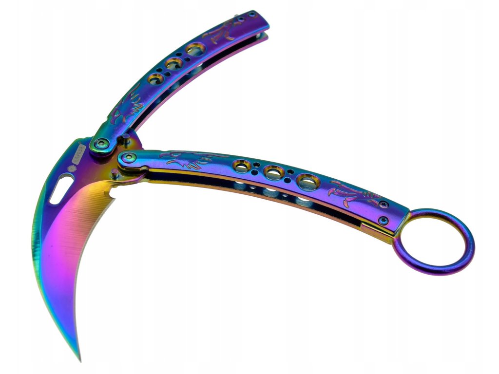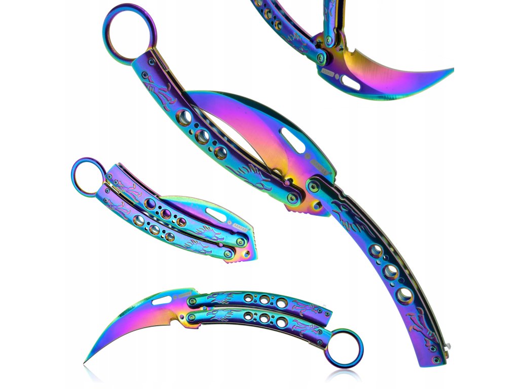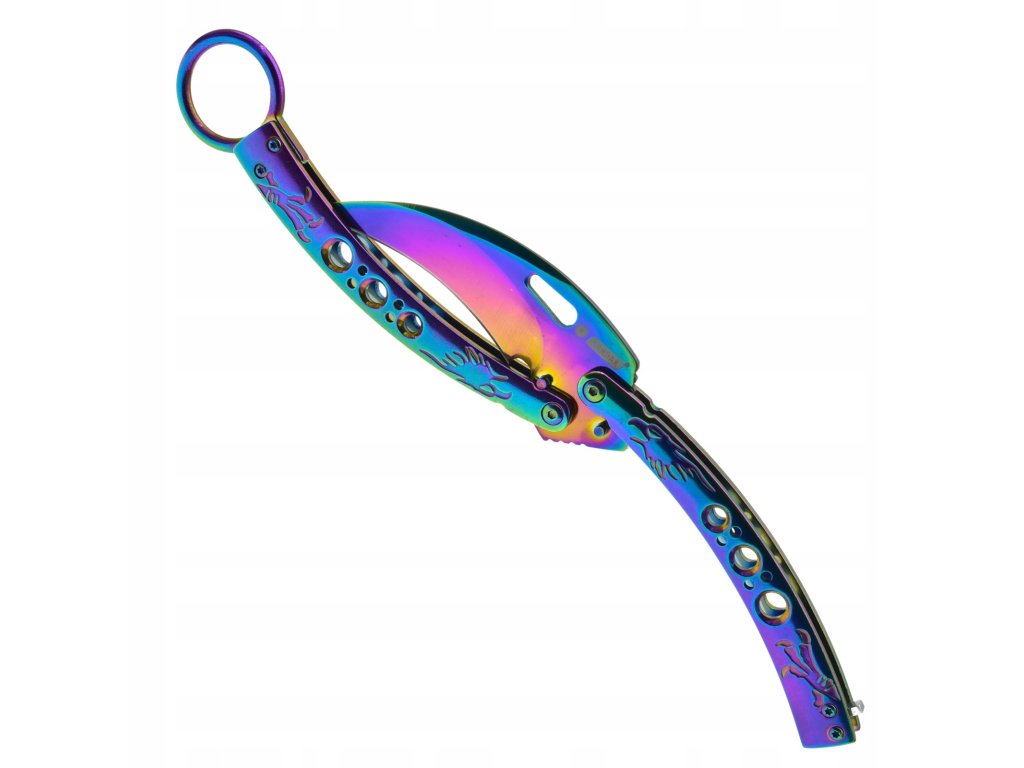 - Okouzlující balisong se zahnutou čepelí v duhových barvách.