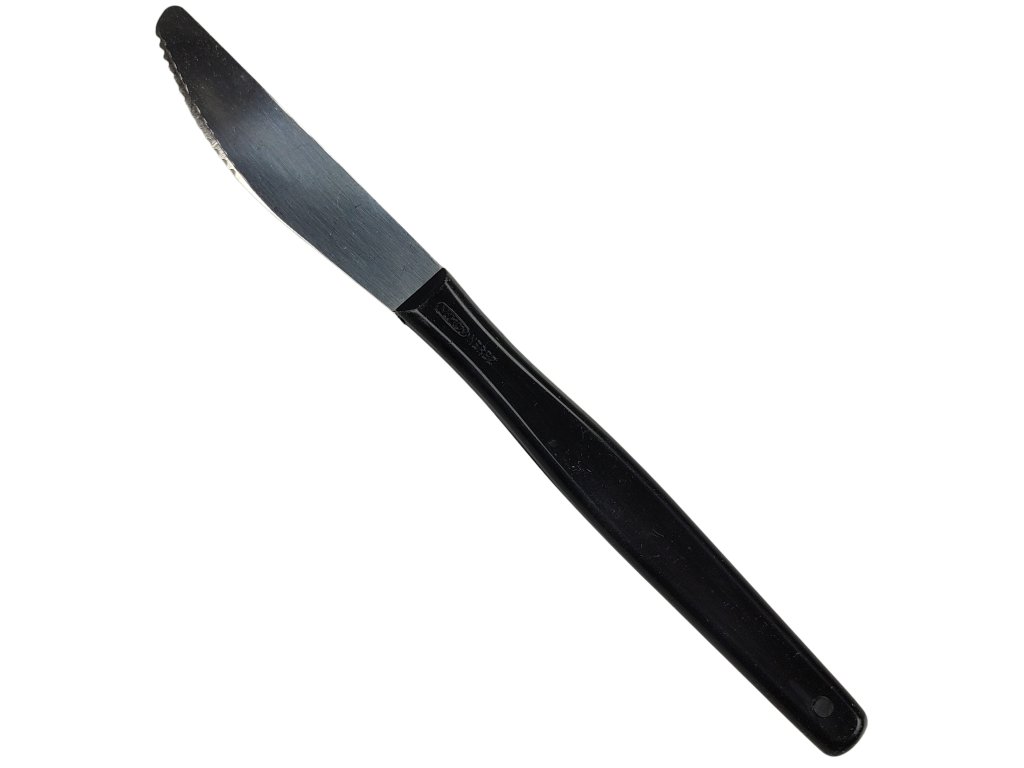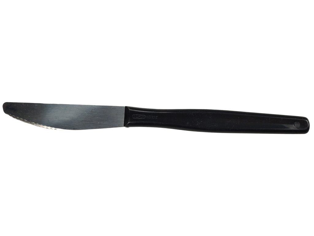 - Jídelní nerezový nůž s ostrým ozubením a černou rukojetí z plastu.