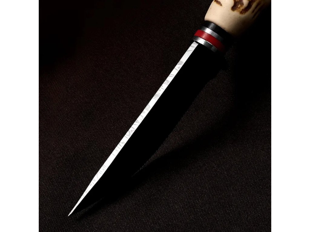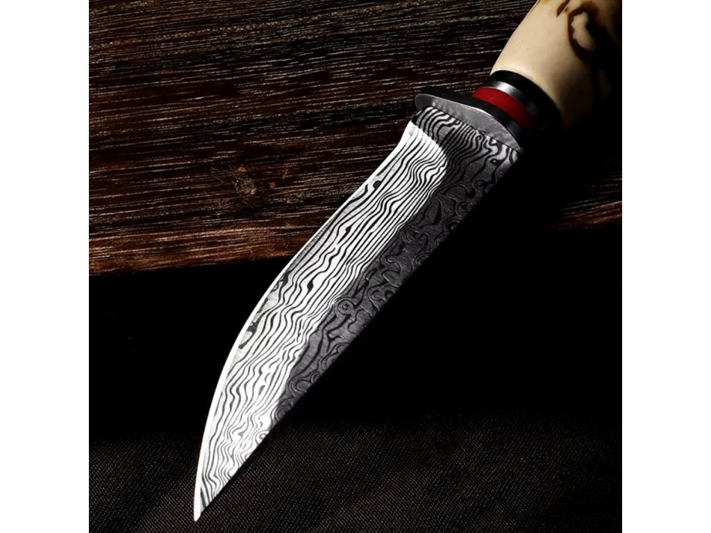- Čepel nože je vyrobena z tvrdé nerezové oceli zdobené elegantním vzorem.