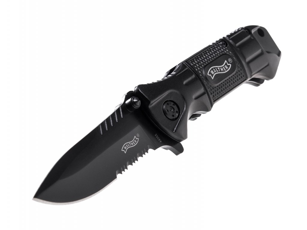 - Taktický nůž německé značky Walther s kombinovaným ostřím ve tvaru Clip-point