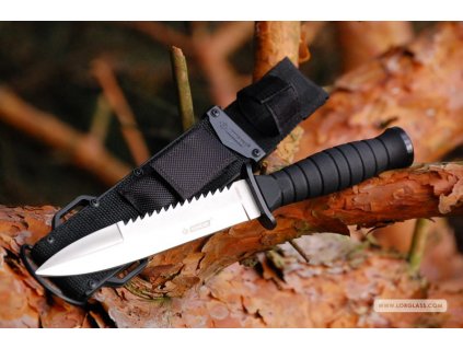 Konstrukce nože odpovídá vojenským požadavkům – robustní čepel z nerezové oceli, ergonomická rukojeť s drážkami pro lepší úchop, a možnost doplnění příslušenství (pilka, šroubovák, pilník). Jeho odolnost a spolehlivost ho předurčují pro náročné použití v terénu.