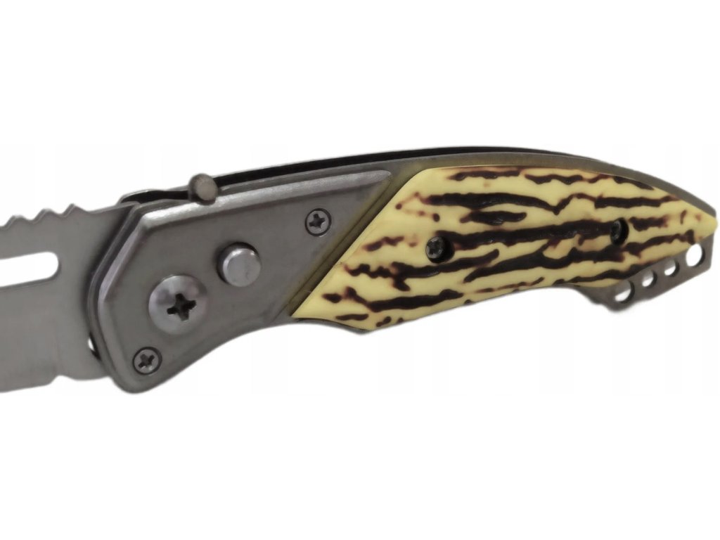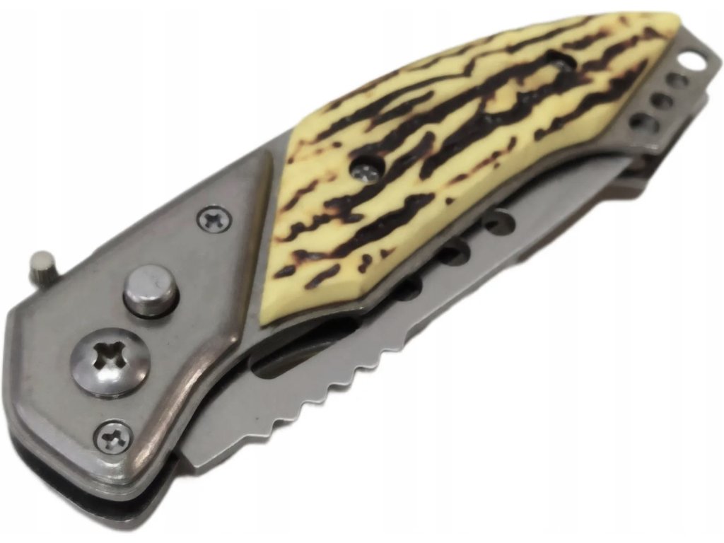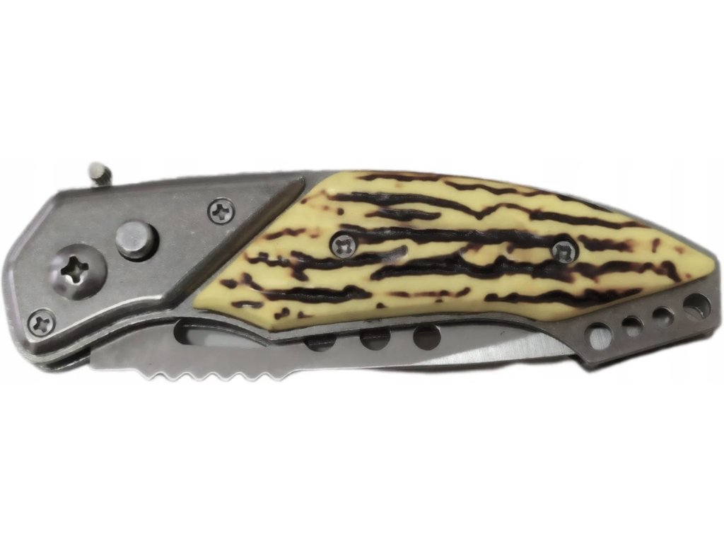 - Kapesní vystřelovací (automatický / pružinový) nůž s rukojetí imitace jelení kosti, zhotovené z pryskyřice.