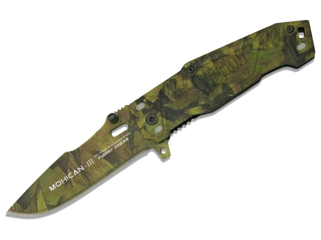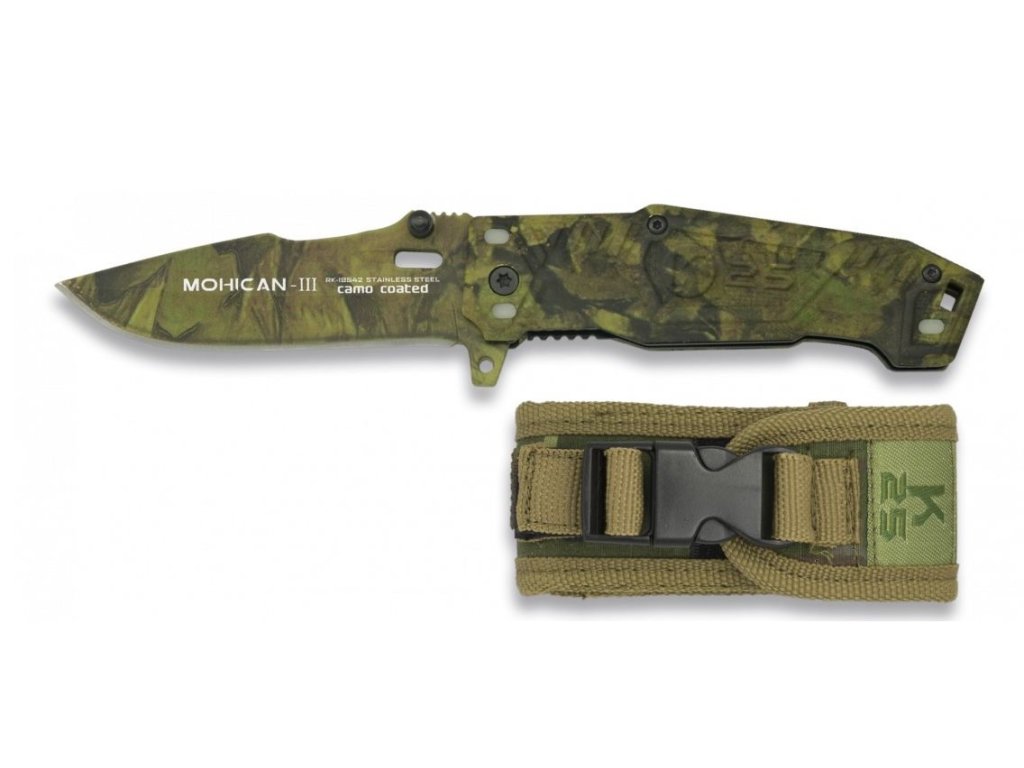 Zavírací nůž španělské značky K25 ze série Mohican, do které patří tři páry nožů, přičemž každý pár tvoří pevný a zavírací nůž ve stejném stylu. Nože jsou určené zejména pro pobyt v přírodě a outdoorové aktivity. Čepel je vyrobena z nerezové oceli 7Cr17Mov s titanovým povrchem, který zlepšuje vlastnosti čepele a odolnost proti opotřebení. Na čepeli je oboustranný kolíček pro snadné otevírání jednou rukou. Nůž lze rovněž otevřít zatlačením na "flipper" vystupující ze hřbetu rukojeti a současným švihnutím zápěstím. Nůž je opatřen vnitřní bezpečnostní pojistkou Liner-Lock, otvorem pro šňůru a fosforeskujícími prvky na rukojeti pro snadnější nalezení nože ve tmě. Střenky jsou hliníkové a celý nůž je v lesním maskovacím provedení Realtree® Camo. Nůž je dodáván se zeleným nylonovým pouzdrem s upínací vazbou systému MOLLE.