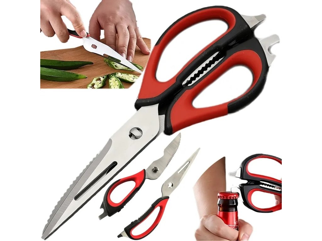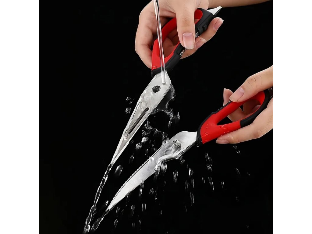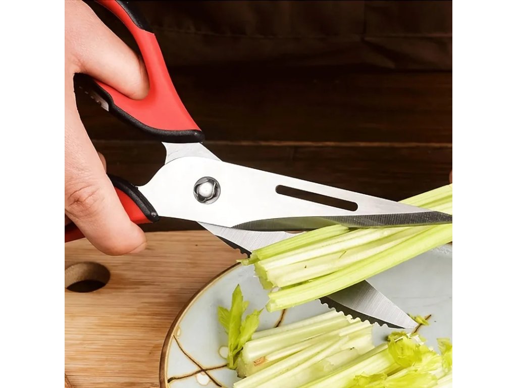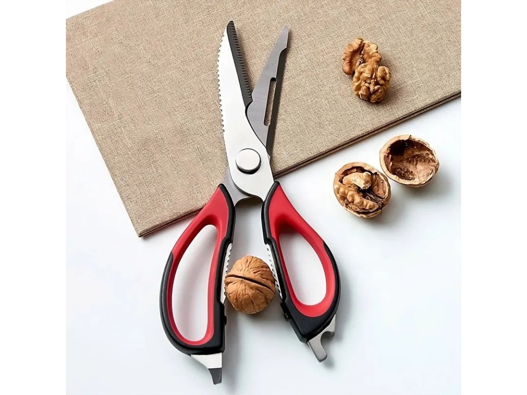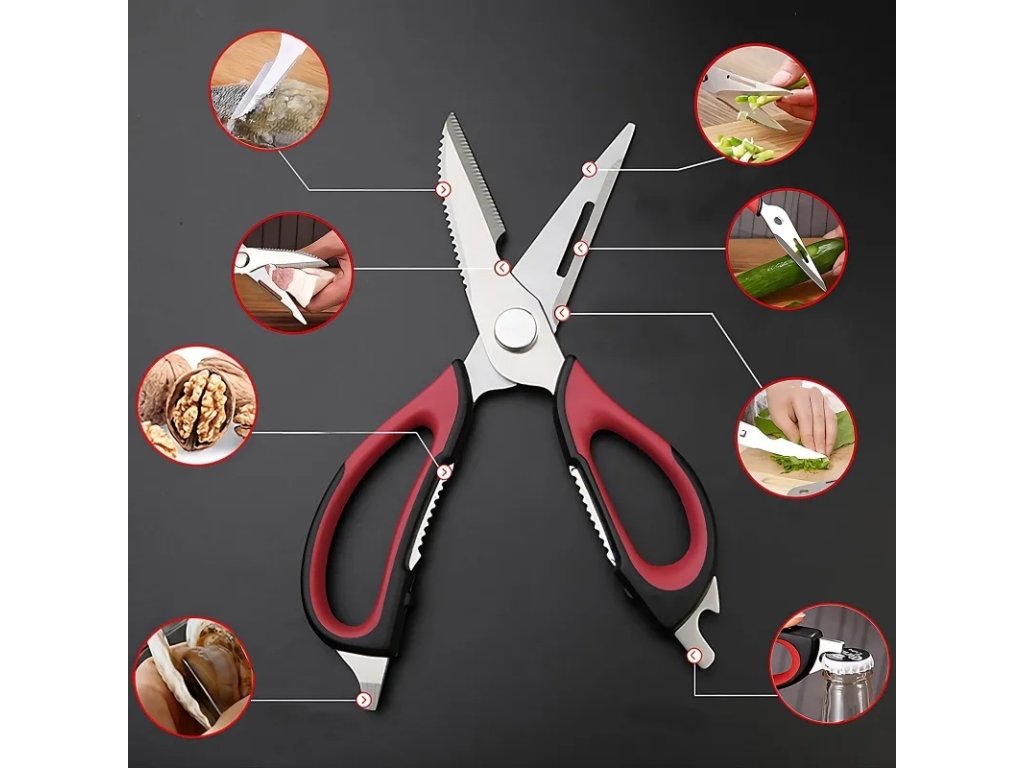 Multifunkční nůžky jsou vynikajícím nástrojem pro amatérské i profesionální kuchaře. Díky své funkčnosti jsou cenným doplňkem vaší domácnosti. Mají protiskluzové rukojeti, které zajišťují, že vám při krájení nevyklouznou z ruky. Lze je použít ke krájení masa, ovoce a zeleniny, otevírání lahví nebo konzerv, šupování ryb a louskání ořechů.