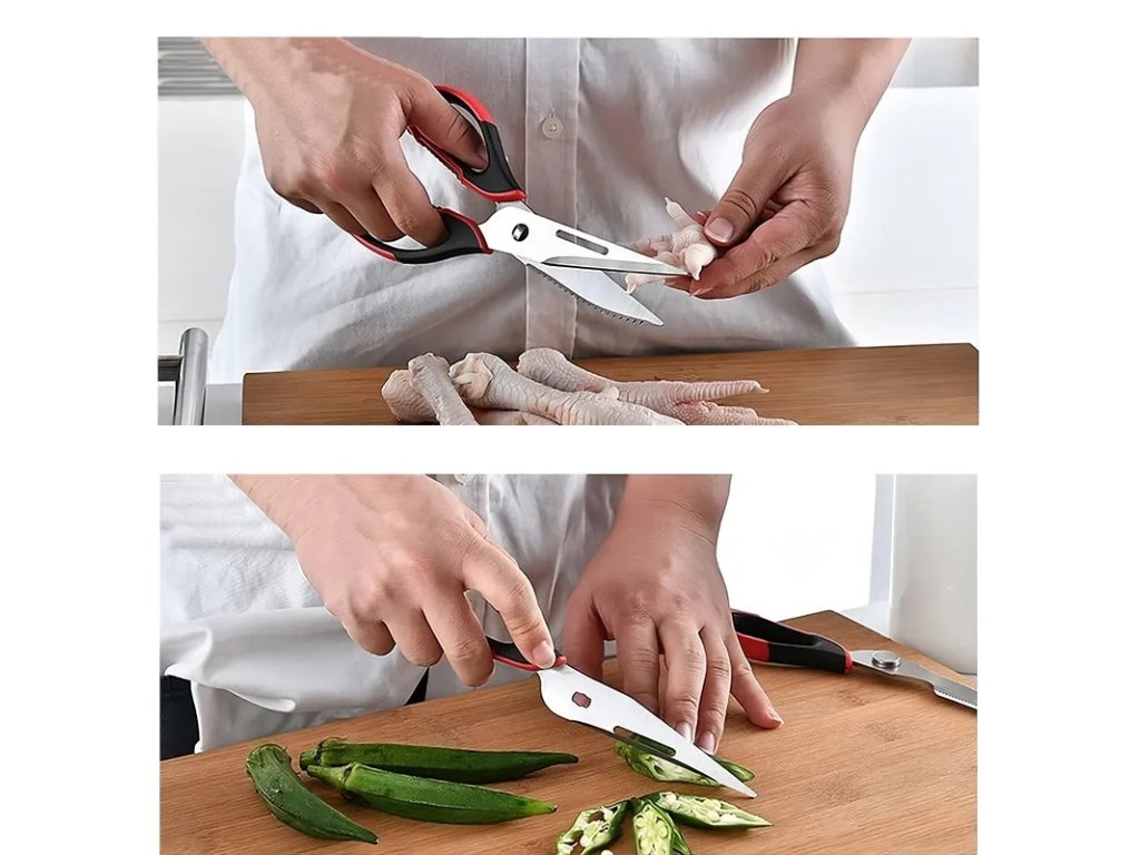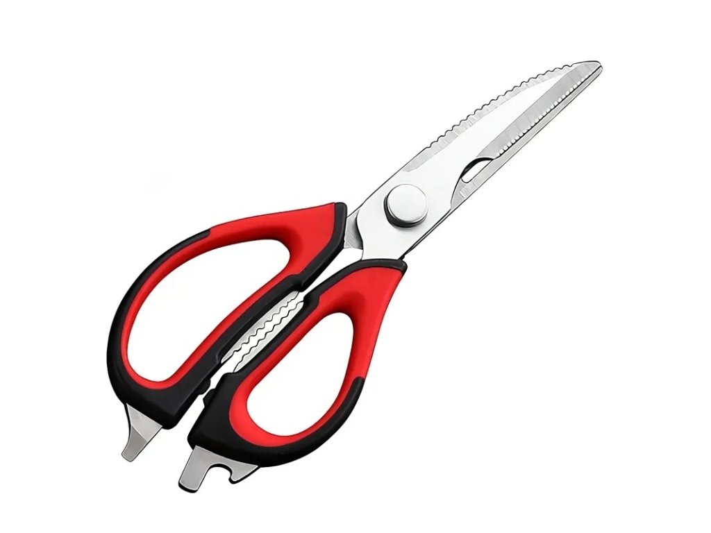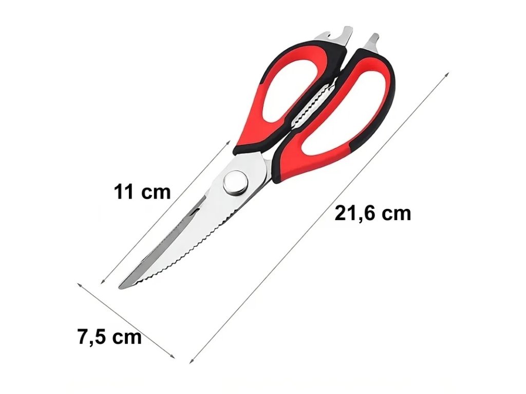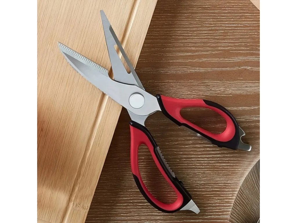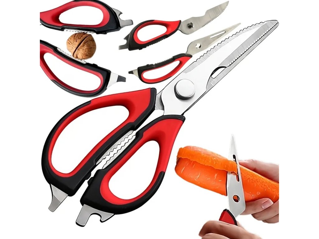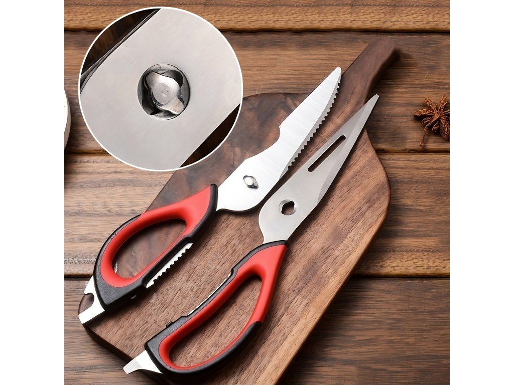 Multifunkční nůžky jsou vynikajícím nástrojem pro amatérské i profesionální kuchaře. Díky své funkčnosti jsou cenným doplňkem vaší domácnosti. Mají protiskluzové rukojeti, které zajišťují, že vám při krájení nevyklouznou z ruky. Lze je použít ke krájení masa, ovoce a zeleniny, otevírání lahví nebo konzerv, šupování ryb a louskání ořechů.