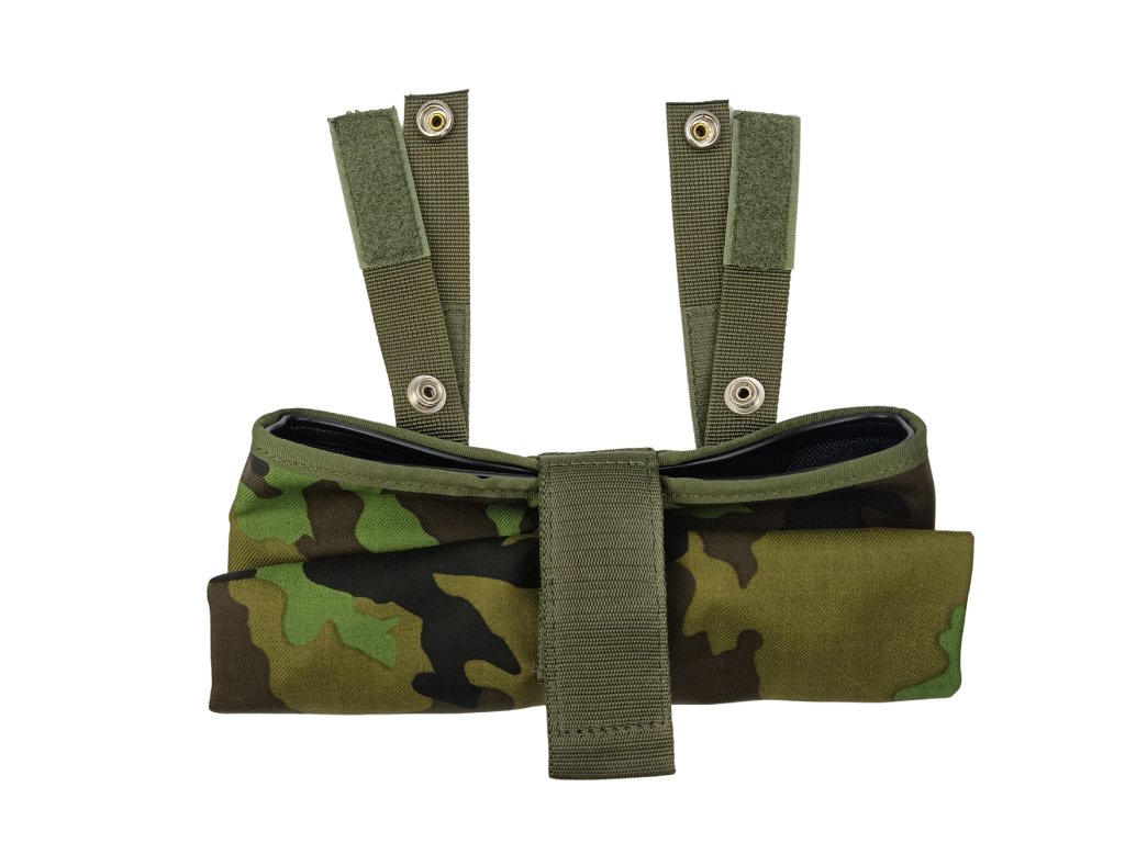 - Odhazovák se připne pomocí dvou popruhů k vestě, opasku nebo systému MOLLE.