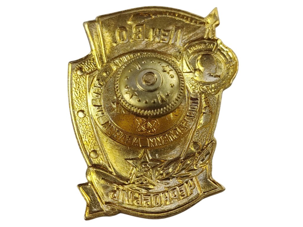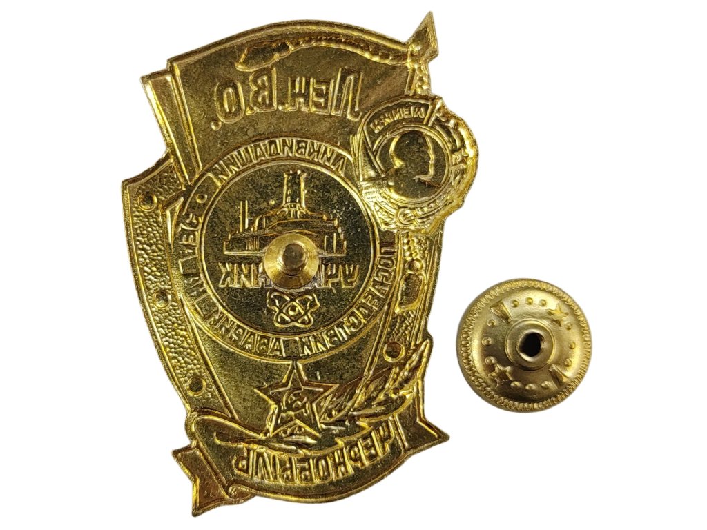 - Horní část: Obsahuje nápis „ЛЕН. В.О.“ (odkaz na Leningradský vojenský okruh) a menší kruhový medailon s portrétem Lenina (Vladimíra Iljiče Lenina).