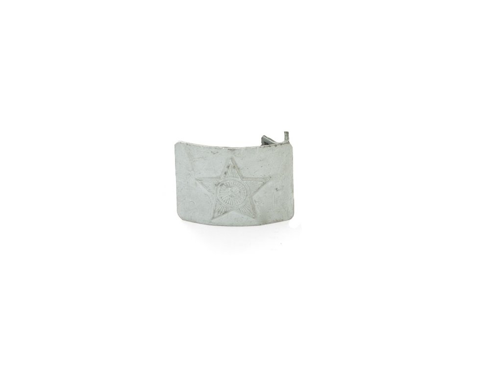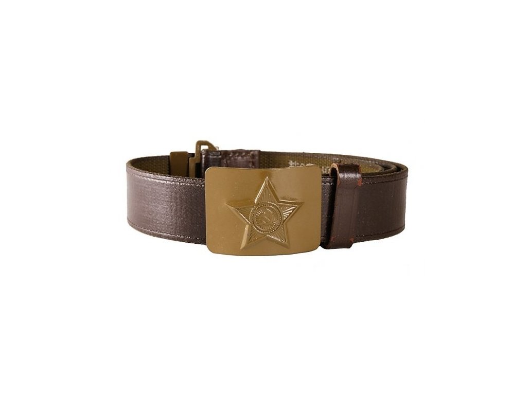 - Kovová přezka, na níž se nachází klasický motiv: pěticípá hvězda s emblémem srpu a kladiva uprostřed, což je charakteristický symbol Sovětského svazu a jeho armády